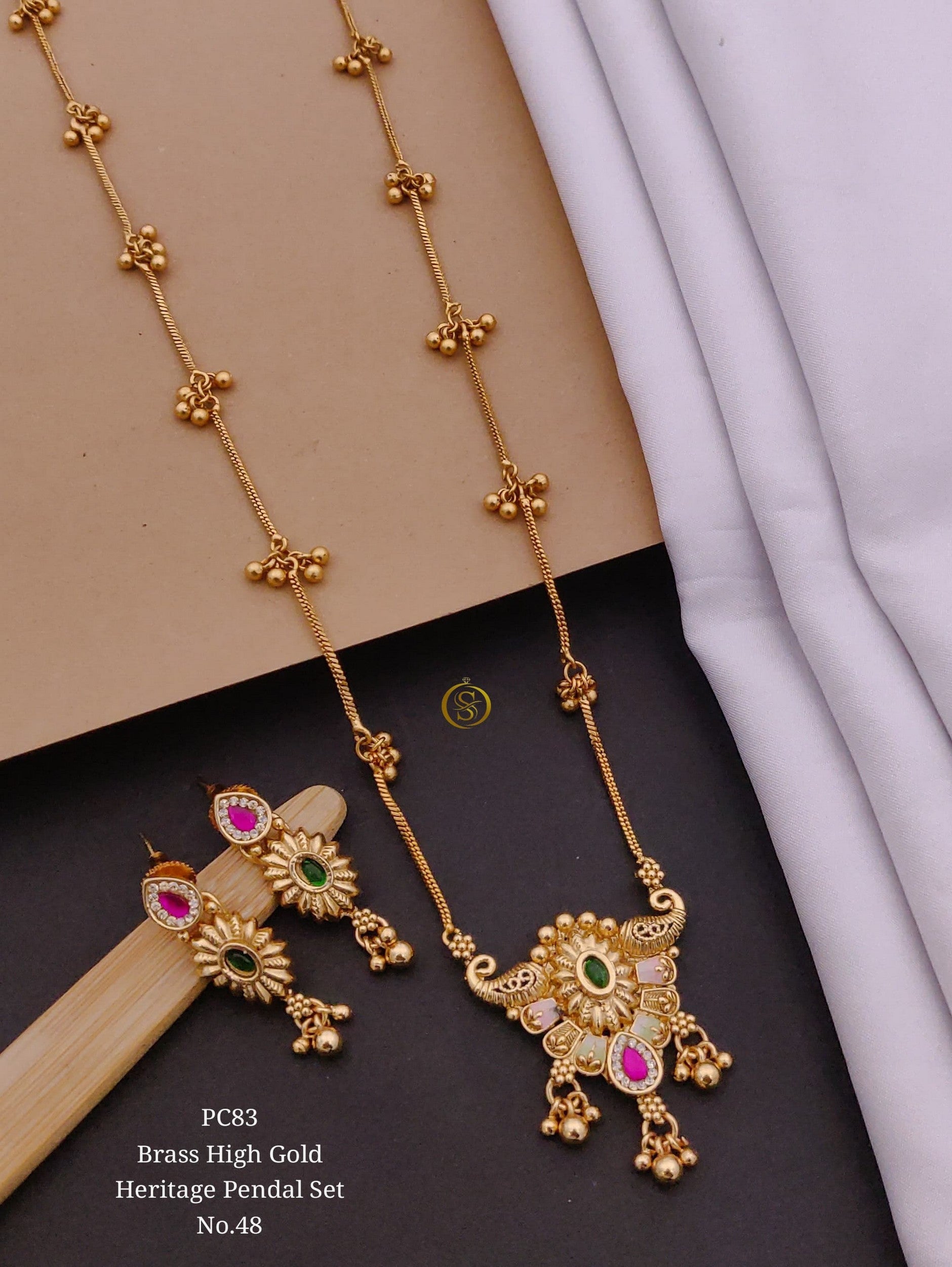 Floral Motif Pendant Set with Pink and Green Stones